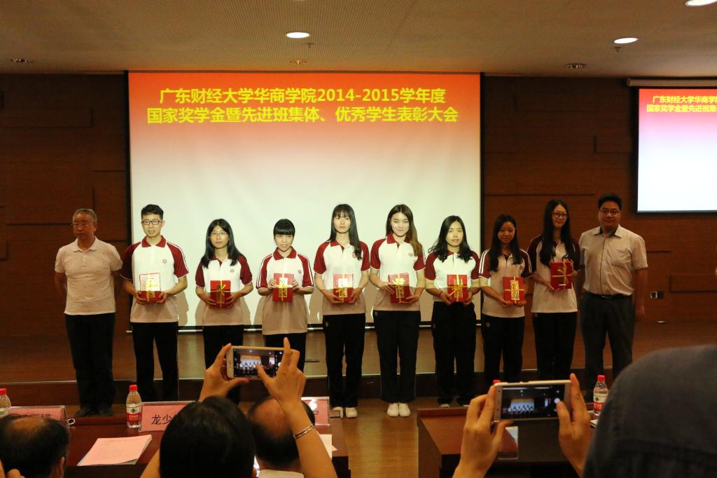 2015年6月21日,在图书馆报告厅举行了广东财经大学华商学院2014-2015学年度国家奖学金暨先进班集体、优秀学生表彰大会。大会由刘德平主持,苏宁书记、马玉珍副院长、龙少锋副院长、杨丽娟副院长、王锦秀副院长、工商管理系主任平海、公共管理系主任周振林、信息工程系主任李建军等多位领导老师参加本次表彰大会。