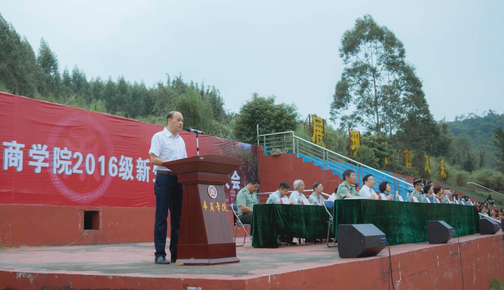 2016920800,广东财经大学华商学院2016级新生军训动员大会在田径运动场举行。本次大会由王锦秀副院长主持。学院党委苏宁书记、支戈壁副院长、马玉珍副院长、杨丽娟副院长、军训团叶计选团长以及各院系主任、行政部门负责人出席了本次大会。