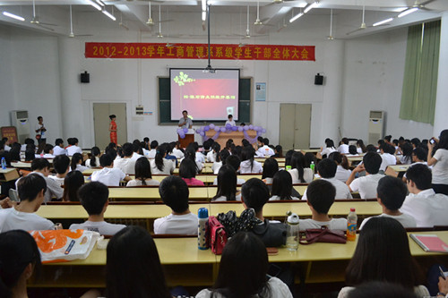 2012年10月23日下午,工商管理系于励志楼B308召开了2012—2013年工商管理系系级干部全体大会。会议邀请了工商管理系陈石清主任,列柏洪副主任和多名分别来自学生会、团总支、记者团、艺术团的指导老师以及各专业的辅导员参加。与会学生干部,均穿着整齐的正装出席,脸上充满着活力与激情。