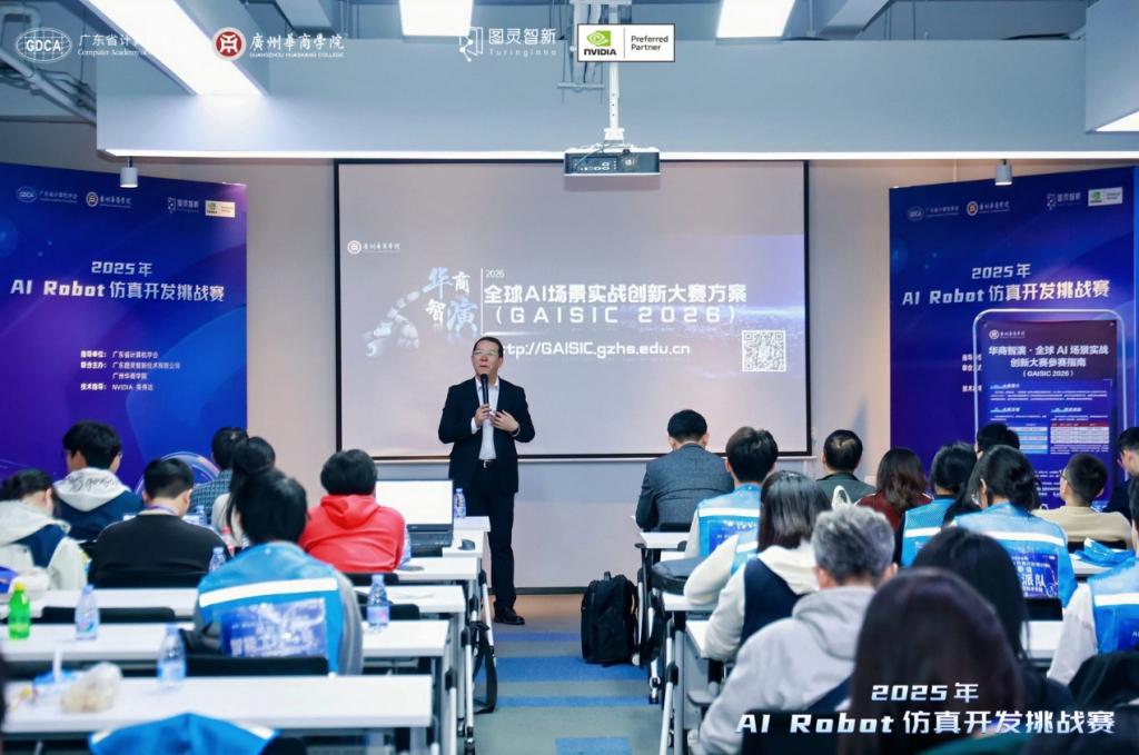 在AI robot开发挑战赛总决赛的现场,广州华商学院吕峻闽副校长亲临赛场,为获奖团队颁奖并再度推介“华商智演·全球AI场景实战创新大赛”。他向来自全国各地的参赛师生、行业专家及企业代表详细介绍了“华商智演”赛事的宗旨、特色与进展,强调该赛事旨在打造一个融合真实产业场景、前沿AI技术与全球高校智慧的实战平台。吕副校长指出,自2025年12月启动以来,“华商智演”已获得广东省计算机学会、广东省机器人协会等权威机构的大力支持,未来将持续扩大影响力,诚邀更多高校与科技企业携手共建AI人才培养新生态。