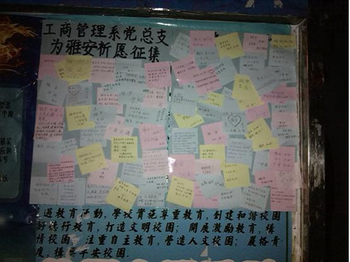 最后,本活动采取无记名方式及自愿原则进行募捐,并于当场清点捐款额,此次活动募捐的款额共计1971.1元,将全部捐到壹基金并公示。另外,给每一位同志颁发便利贴写下对雅安最诚挚的祈愿。